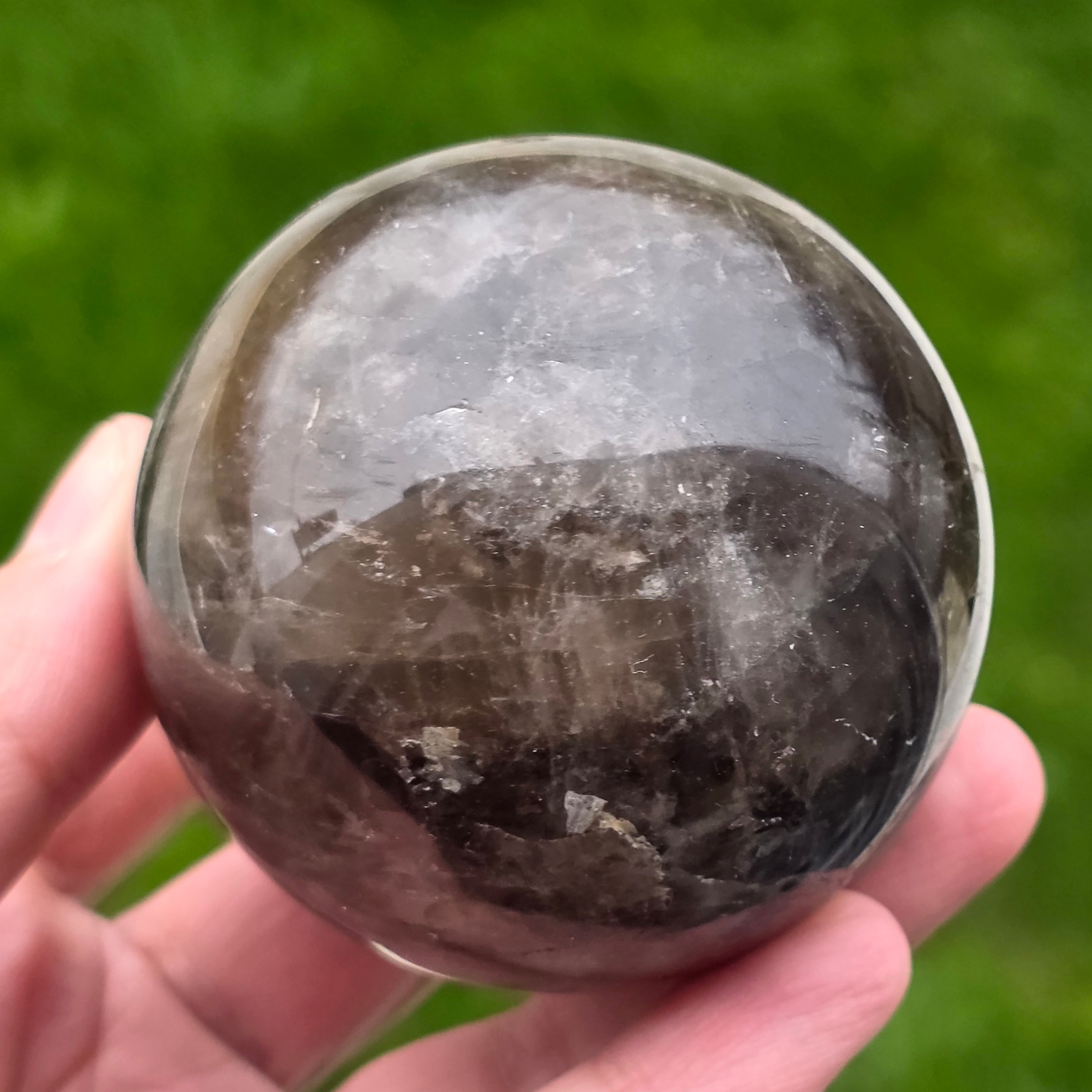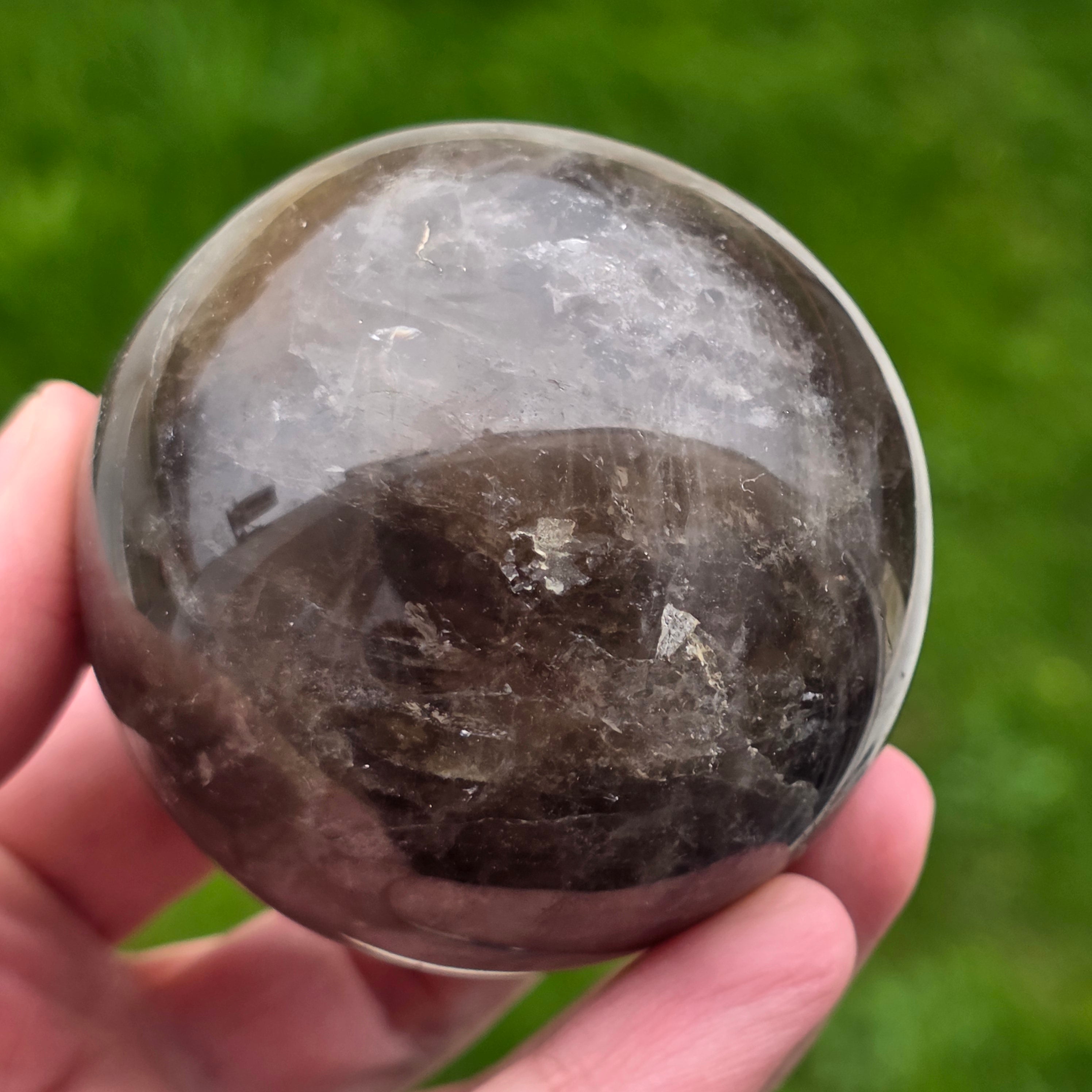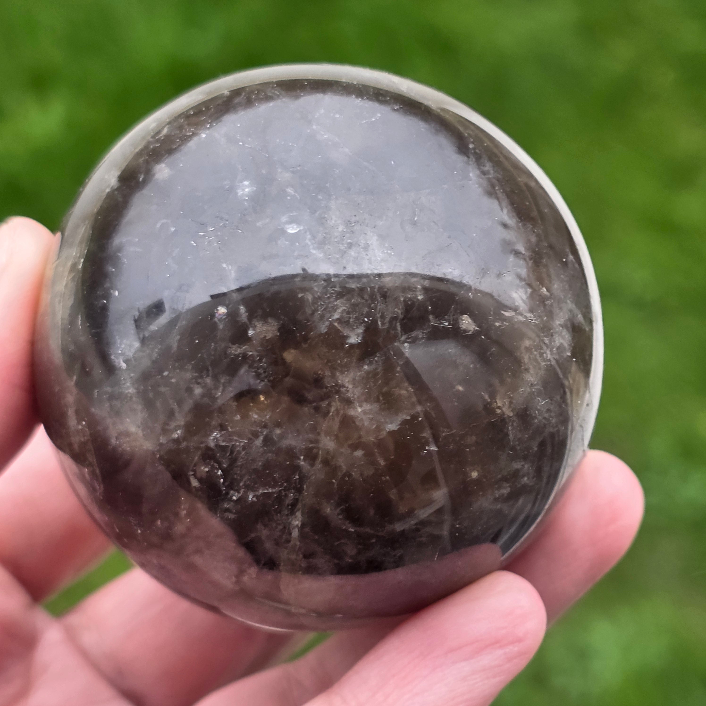Sfera z morionového kremeňa je silný a elegantný kus, známy svojou hlbokou farbou, podobnou hustému dymu alebo priehľadnému obsidiánu. Morion je najtmavšia odroda dymového kremeňa a v tejto dokonale guľatej forme odhaľuje diskrétne odlesky, jemné vnútorné detaily a naozaj sofistikovanú vizuálnu prítomnosť.