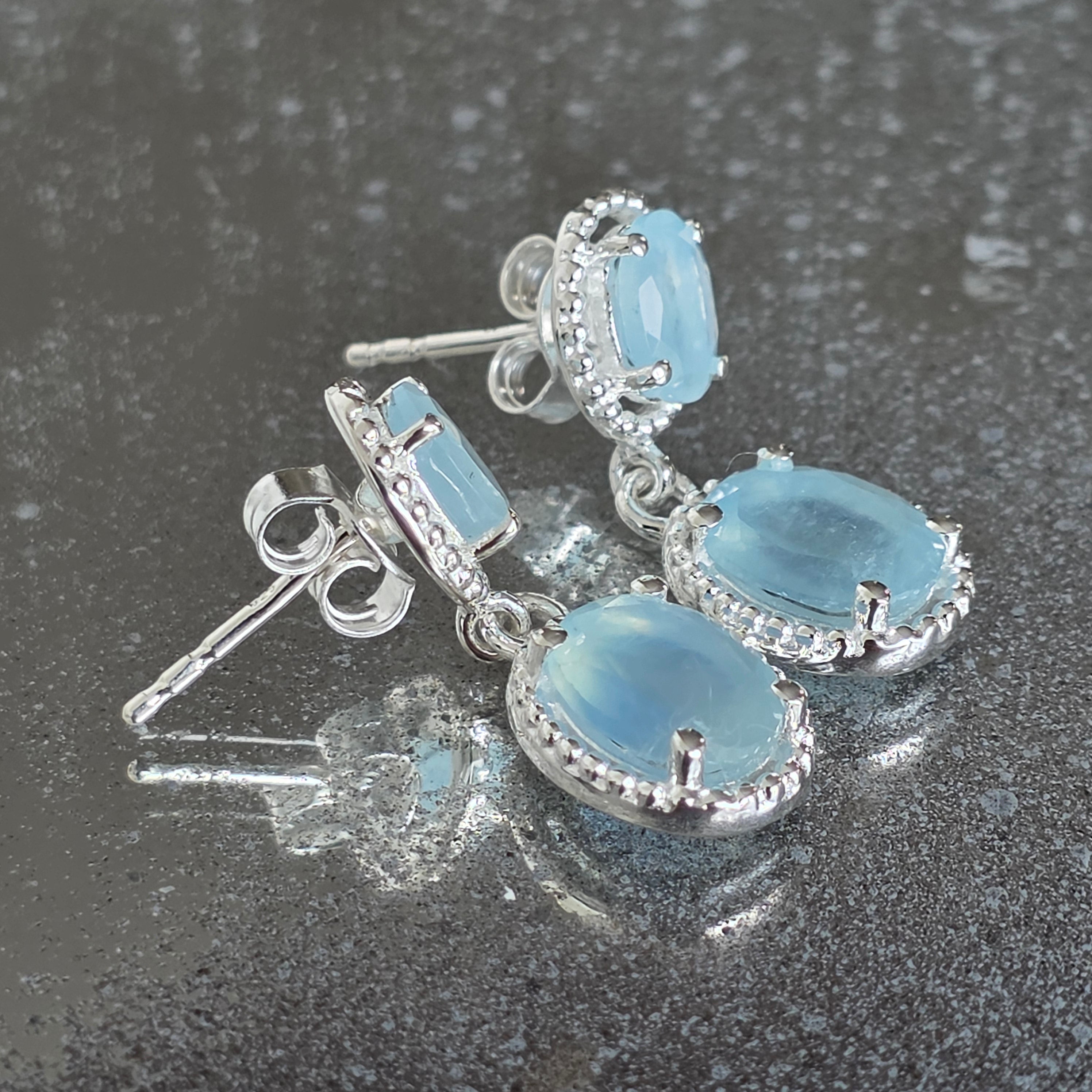 Náušnice „Aqua 2“ zaujmú elegantným a plynulým dizajnom, v ktorom sú dva akvamarínové kamene usporiadané do radu, vytvárajúc predĺžený a rafinovaný efekt.