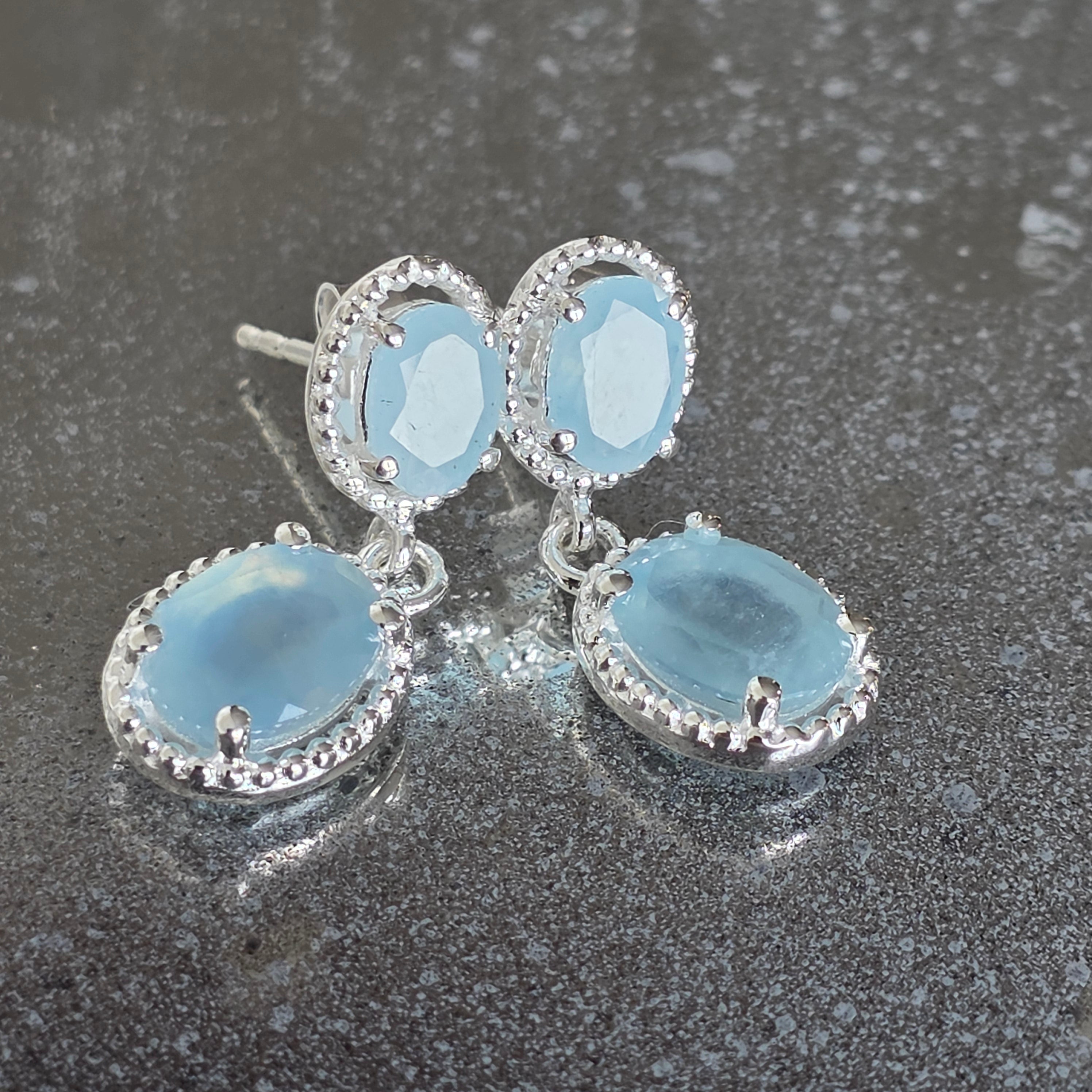 Ich jemné modré odtiene sa harmonicky dopĺňajú, odrážajú svetlo subtílnym spôsobom a dodávajú sviežu, ale vyváženú prítomnosť. Jemné striebro 925 zvýrazňuje tvar kameňov bez toho, aby vizuálne zaťažovalo šperk.
