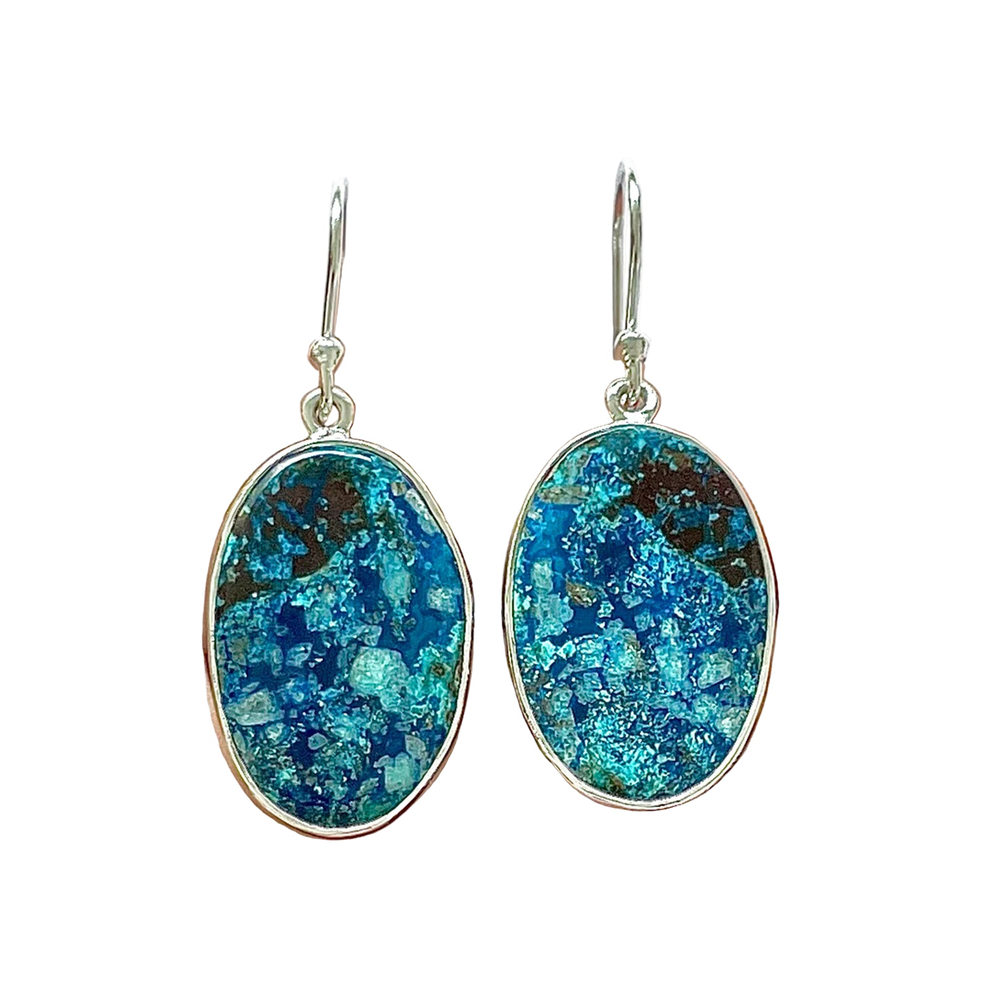 Tieto jedinečné náušnice zo shattuckitu ťa zavedú hlboko do oceánu, kde sa intenzívna modrá mieša s tyrkysovými odleskami a jemnými zemitými žilami. Kameň s živými a organickými textúrami sa zdá, že uchováva v sebe tajomstvo vôd a pokoj hlbín.