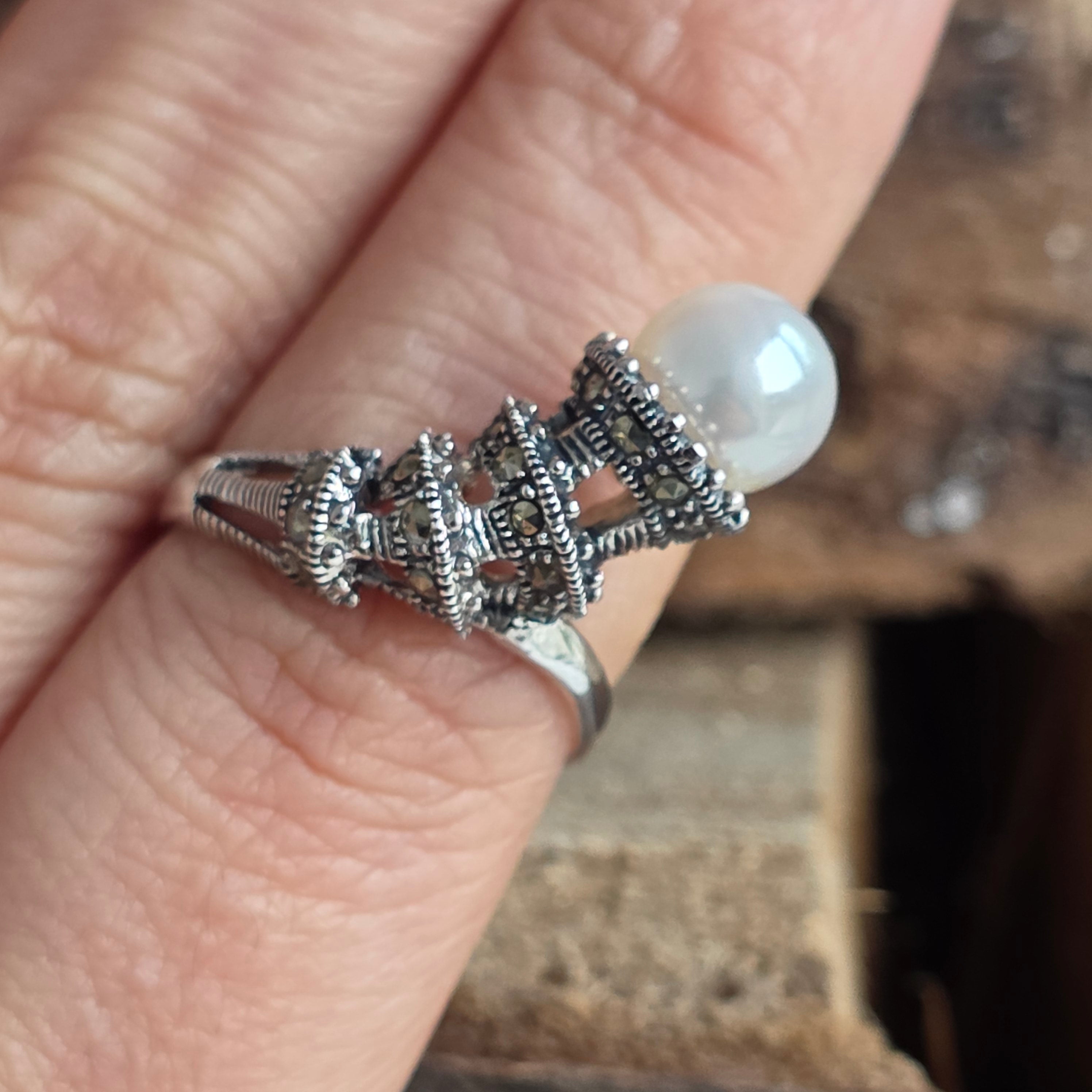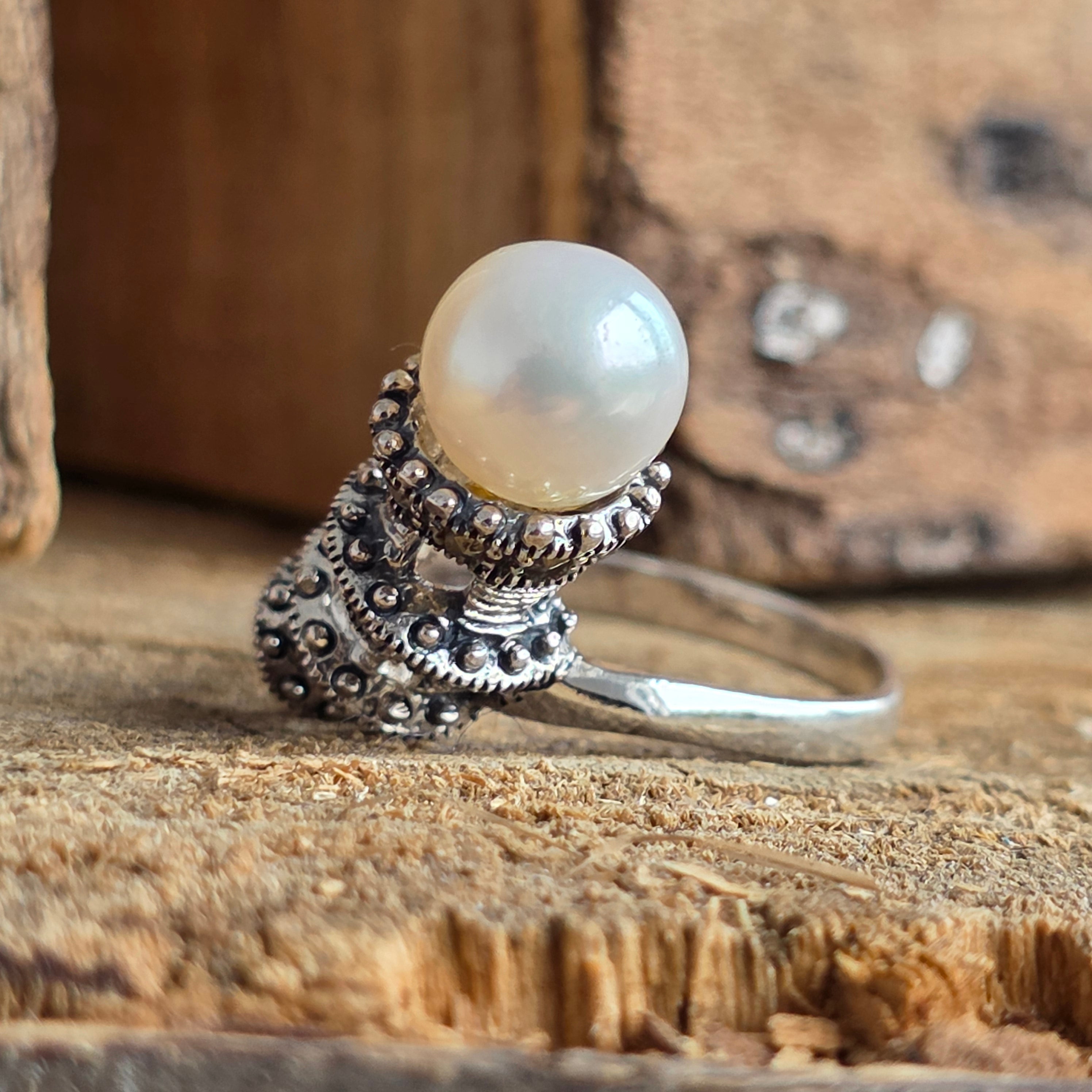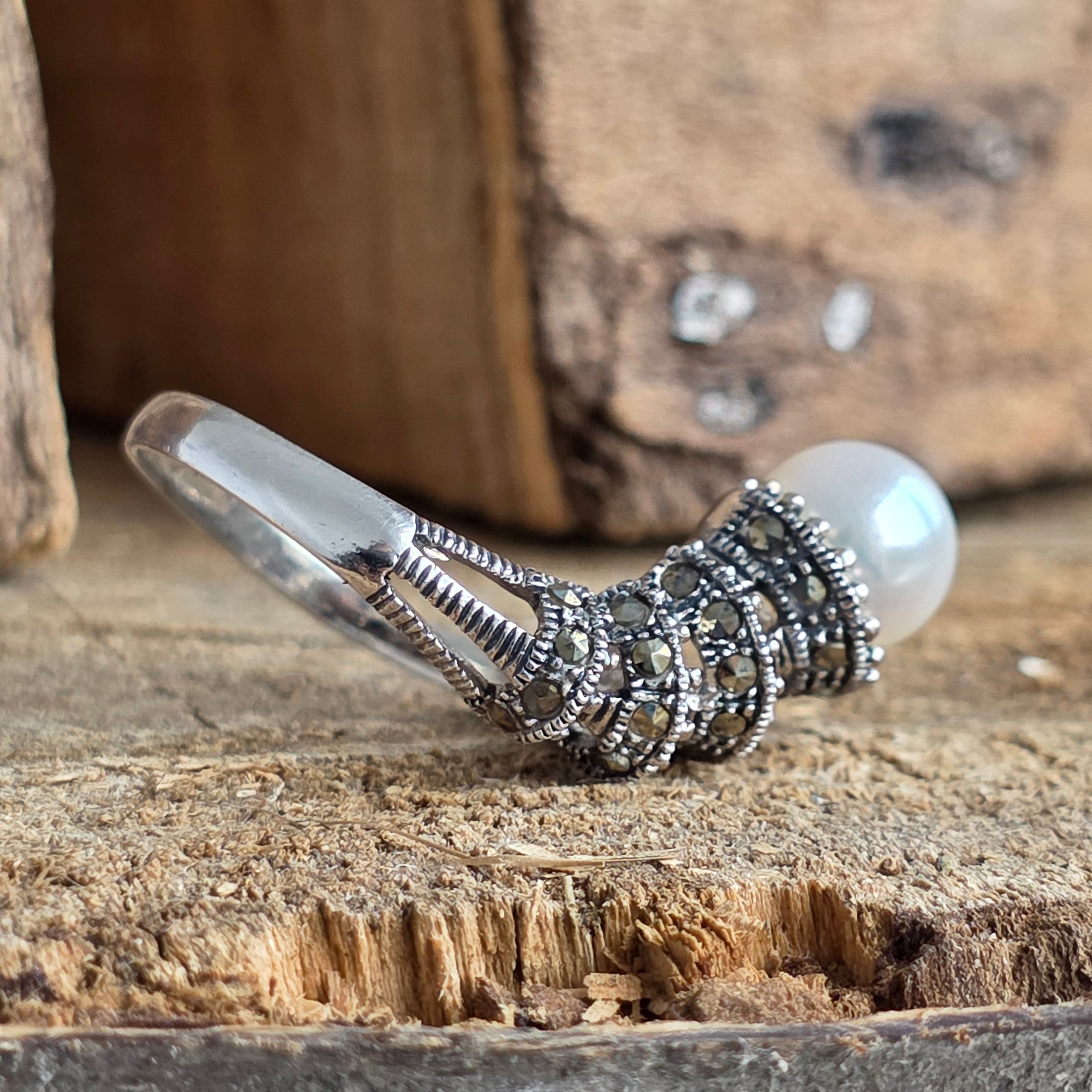 Toto je symbol nadčasovej elegancie Strieborný prsteň 925 spája zamatové svetlo prírodné perly s kovovými odleskami markazit, v dizajne, ktorý evokuje čaro klasických šperkov.
