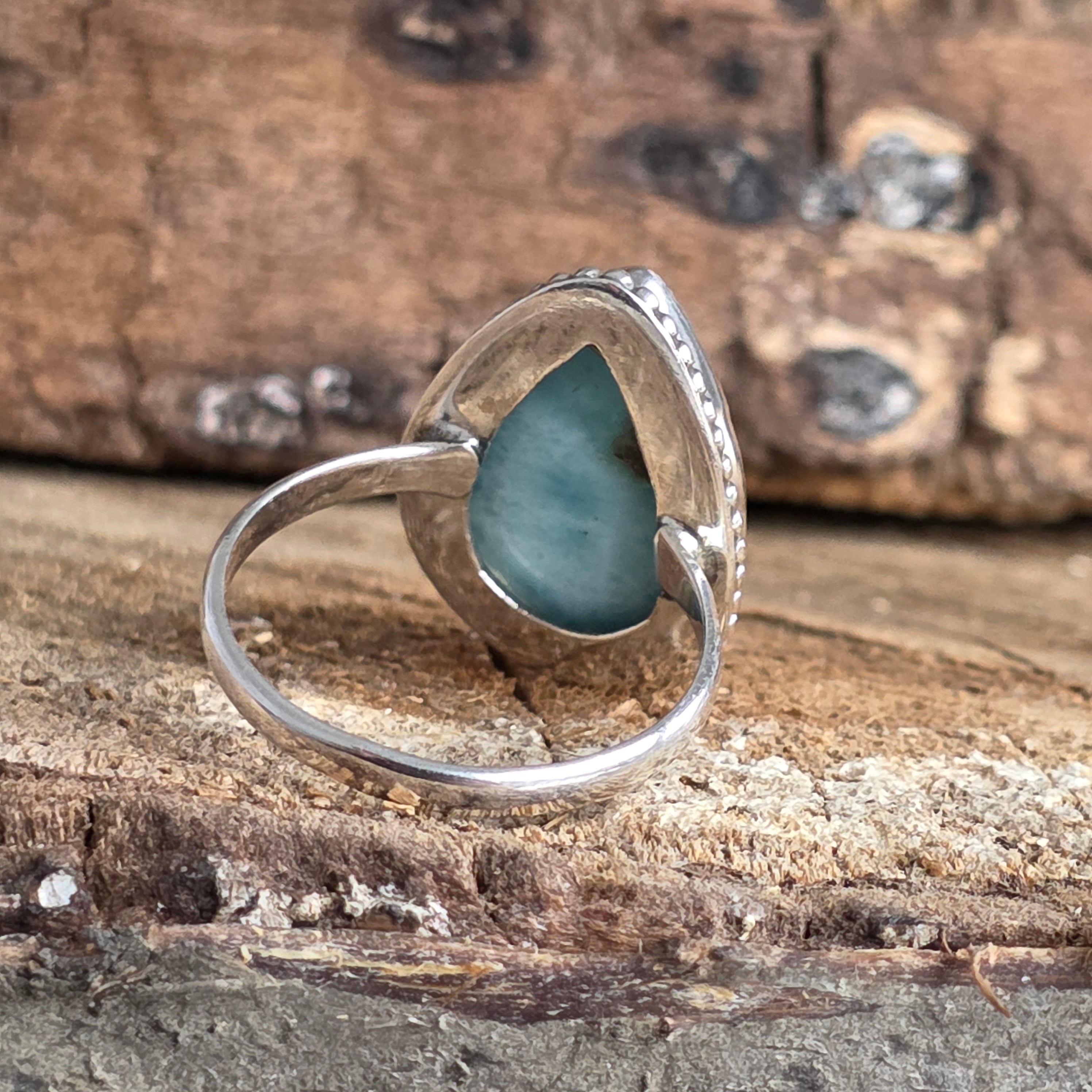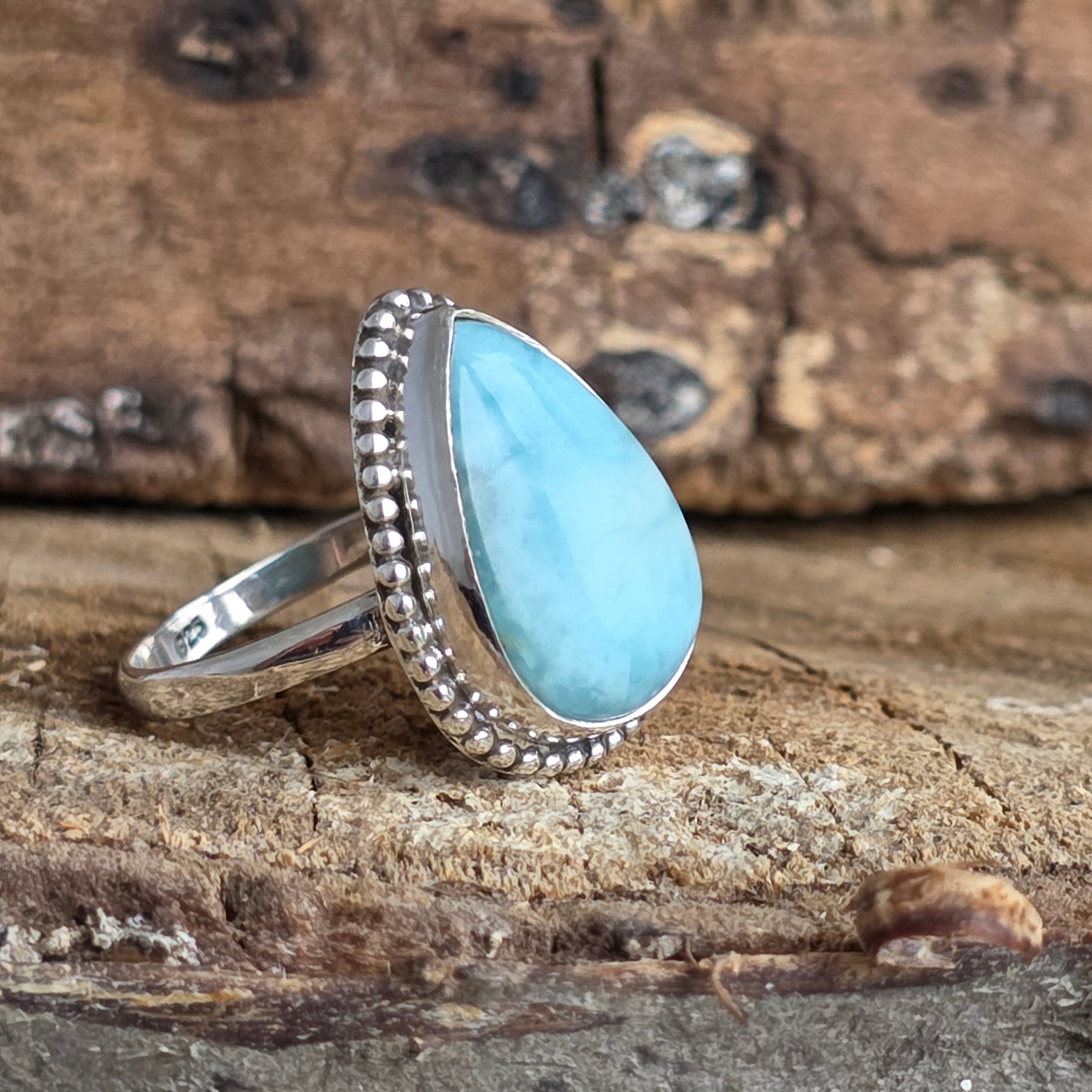 Elegantný prsteň zo striebra 925 s prírodným larimarom, v námorníckych modrých odtieňoch evokujúcich vody Karibiku. Detaily rawa work ručne vypracované dodávajú tejto autentickej bižutérii hĺbku a rafinovanosť.