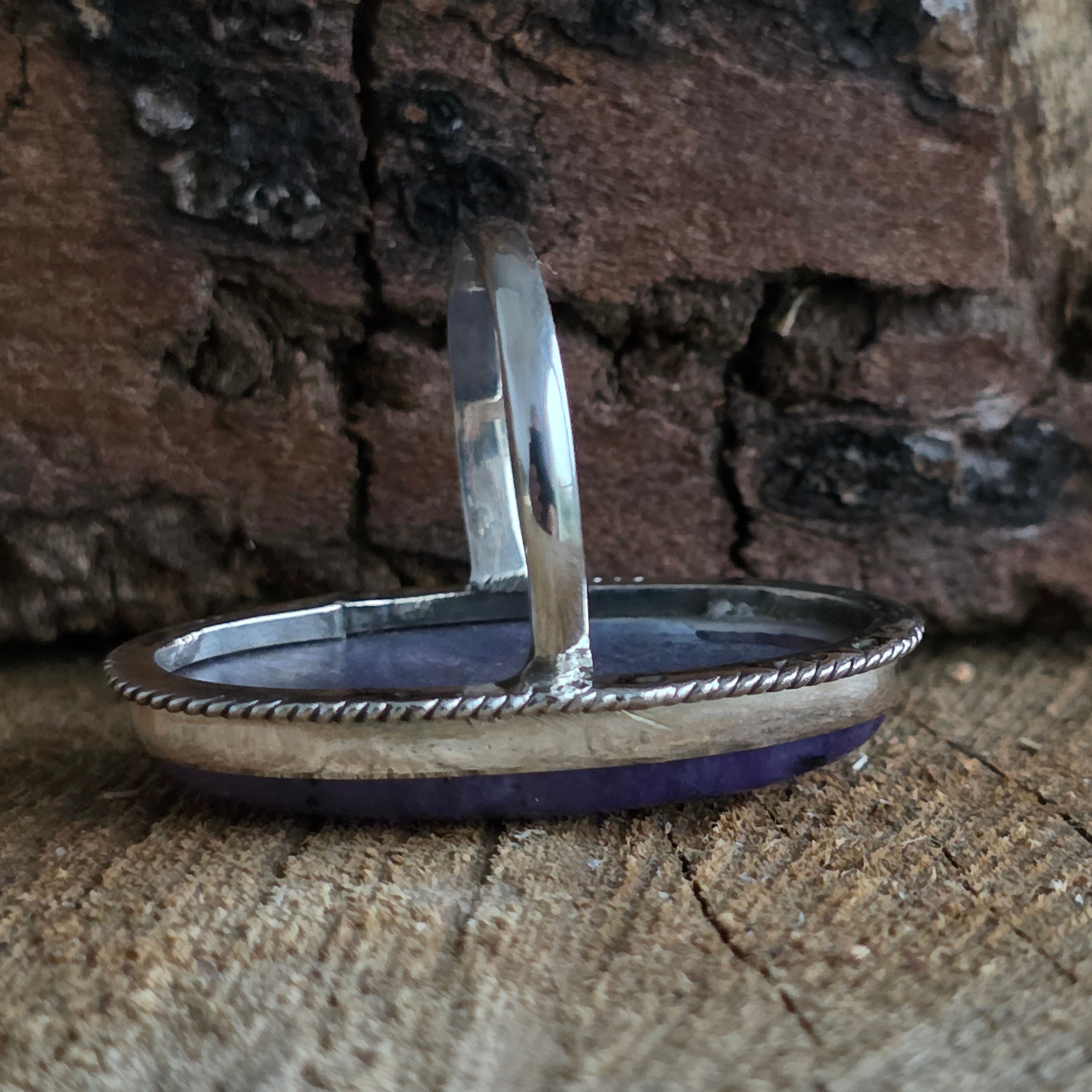 Masívny prsteň, ručne spracovaný z striebra 925, ktorý obsahuje prírodný kameň Charoit, s výraznými fialovými odtieňmi a hodvábnymi odleskami, ktoré pripomínajú kozmický obraz. Dekoratívny rám v štýle twisted wire work pridáva hĺbku a rafinovanosť, vyvažujúc modernú eleganciu s tradičným remeselným spracovaním.