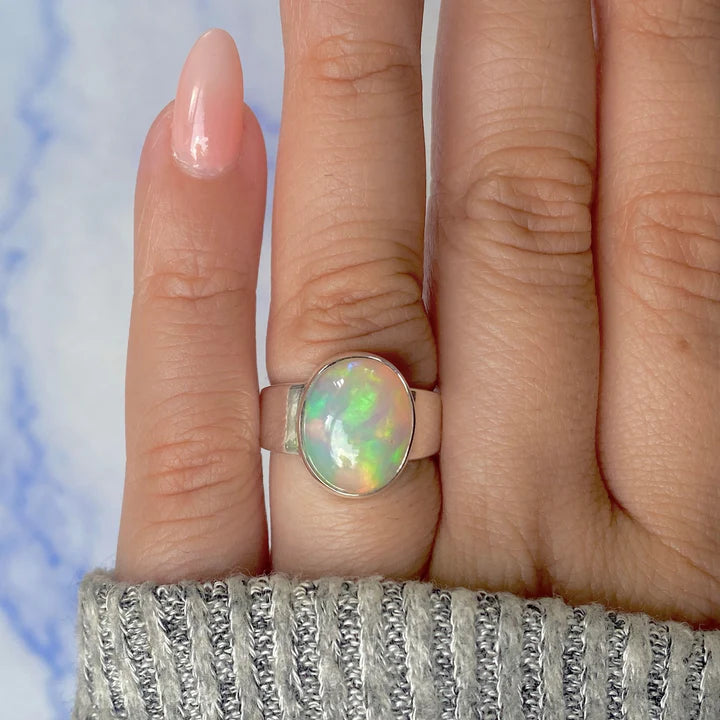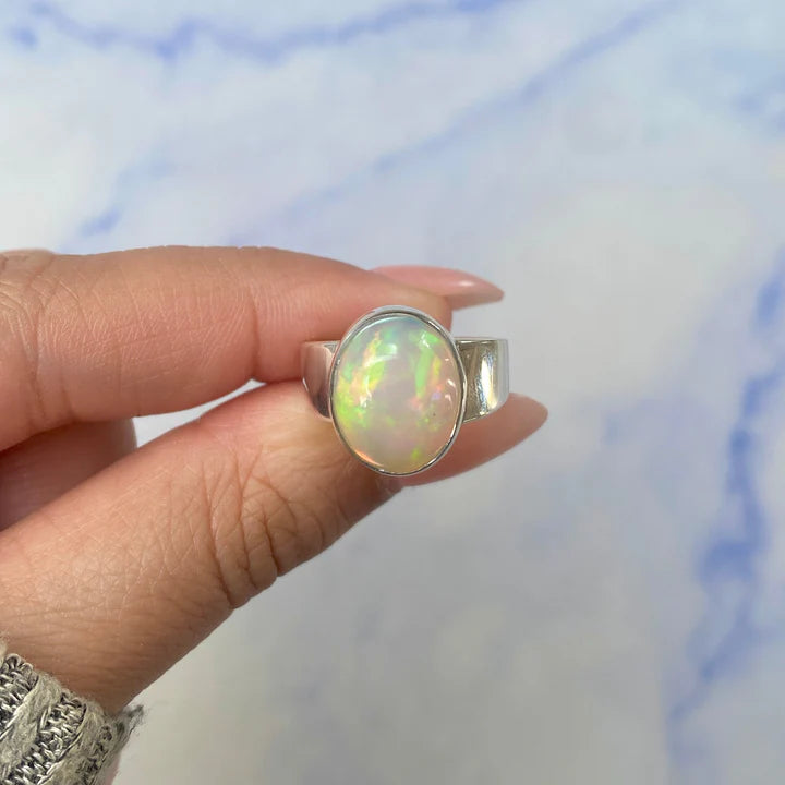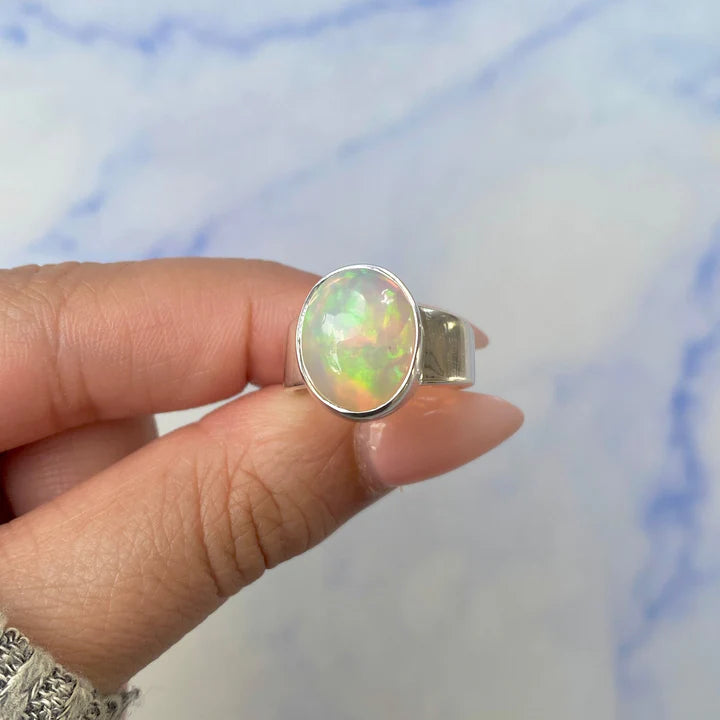 Elegantný a rafinovaný prsteň, vyrobený z striebra 925, s prírodným kameňom etiopským opálom, známy svojimi irizujúci odleskmi v odtieňoch zelenej, červenej a modrej. Minimalistický dizajn plain wire setting umožňuje kameňu byť stredobodom pozornosti, pričom zachytáva svetlo z každého uhla.