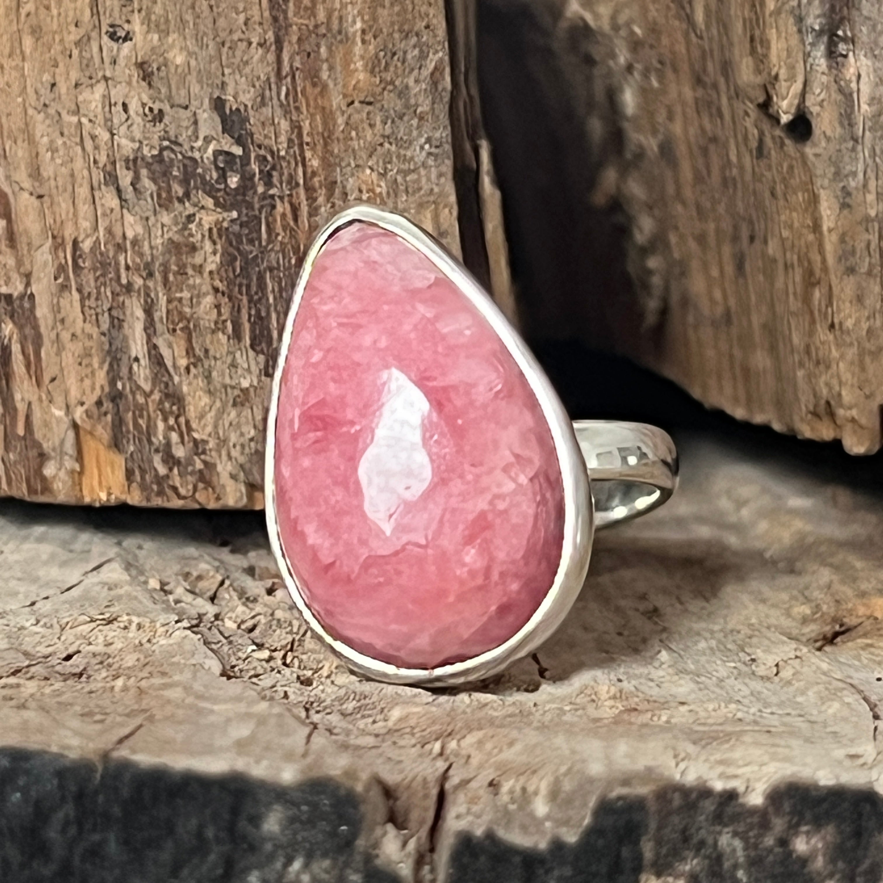 Tento prsteň s prírodným rhodochrozitom osadeným v striebre 925 je výnimočný kúsok, ktorý spája krásu kameňa s klasickou eleganciou striebra. Každý prsteň je jedinečný vďaka ružovo-koralovému žíhaniu typickému pre rhodochrozit, čo ho robí skutočným zbierkovým šperkom.