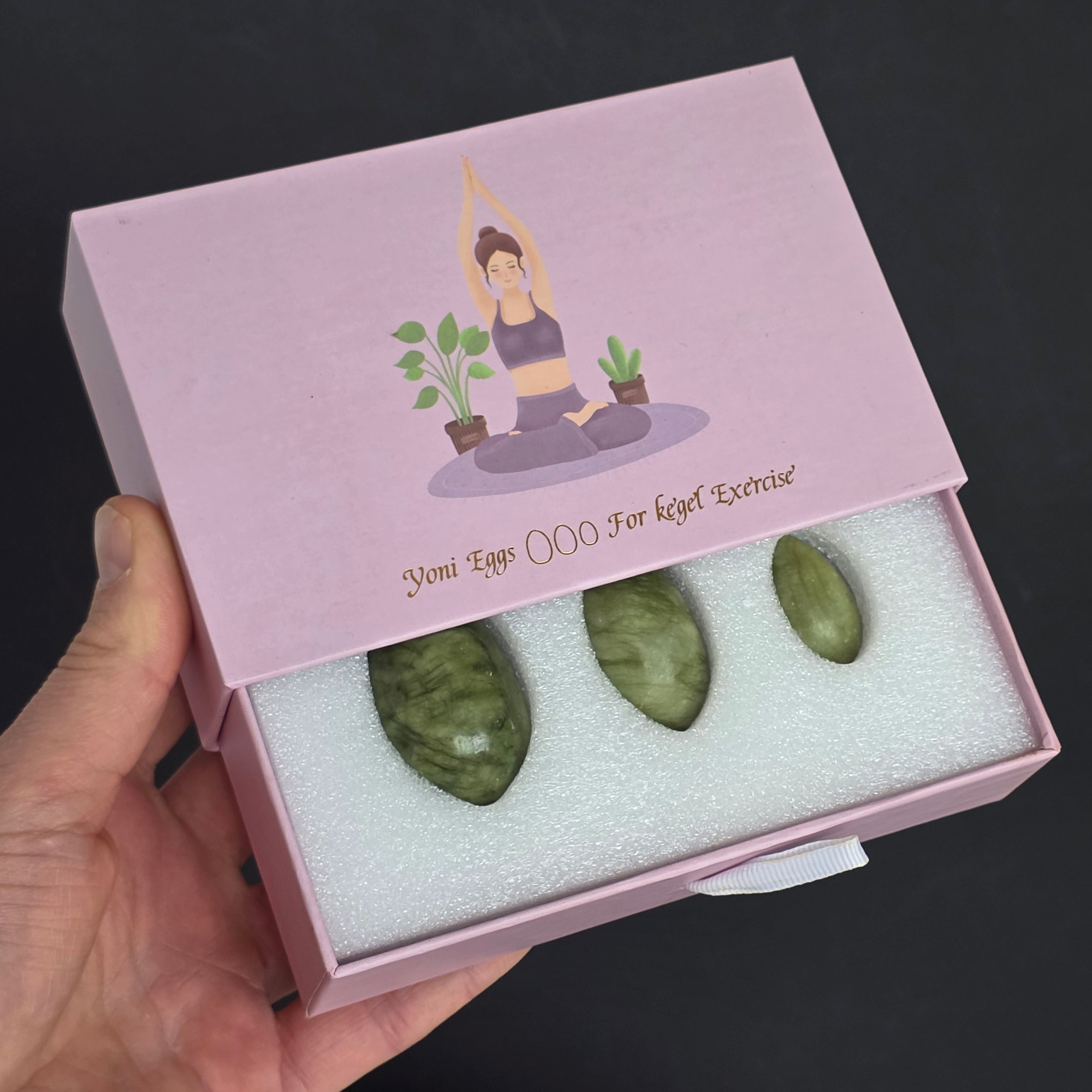 Descriere - Yoni vajcia zo zeleného jadeitu (s dierkou, šnúrkou) - Sada 3 kusov zabalená v darčekovej krabičke
